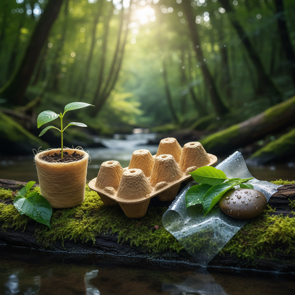 Opakowania biodegradowalne z biomateriału na tle zieleni, ekologia, środowisko, biomateriały