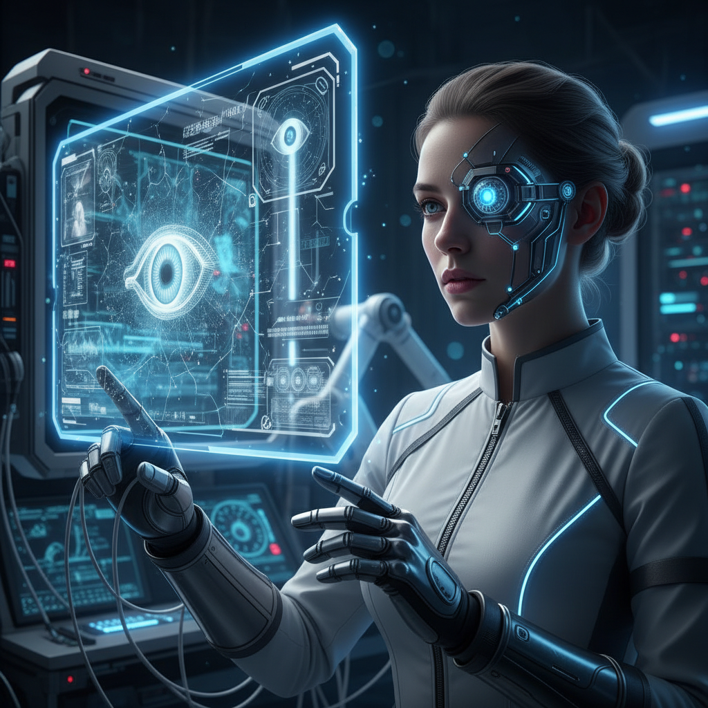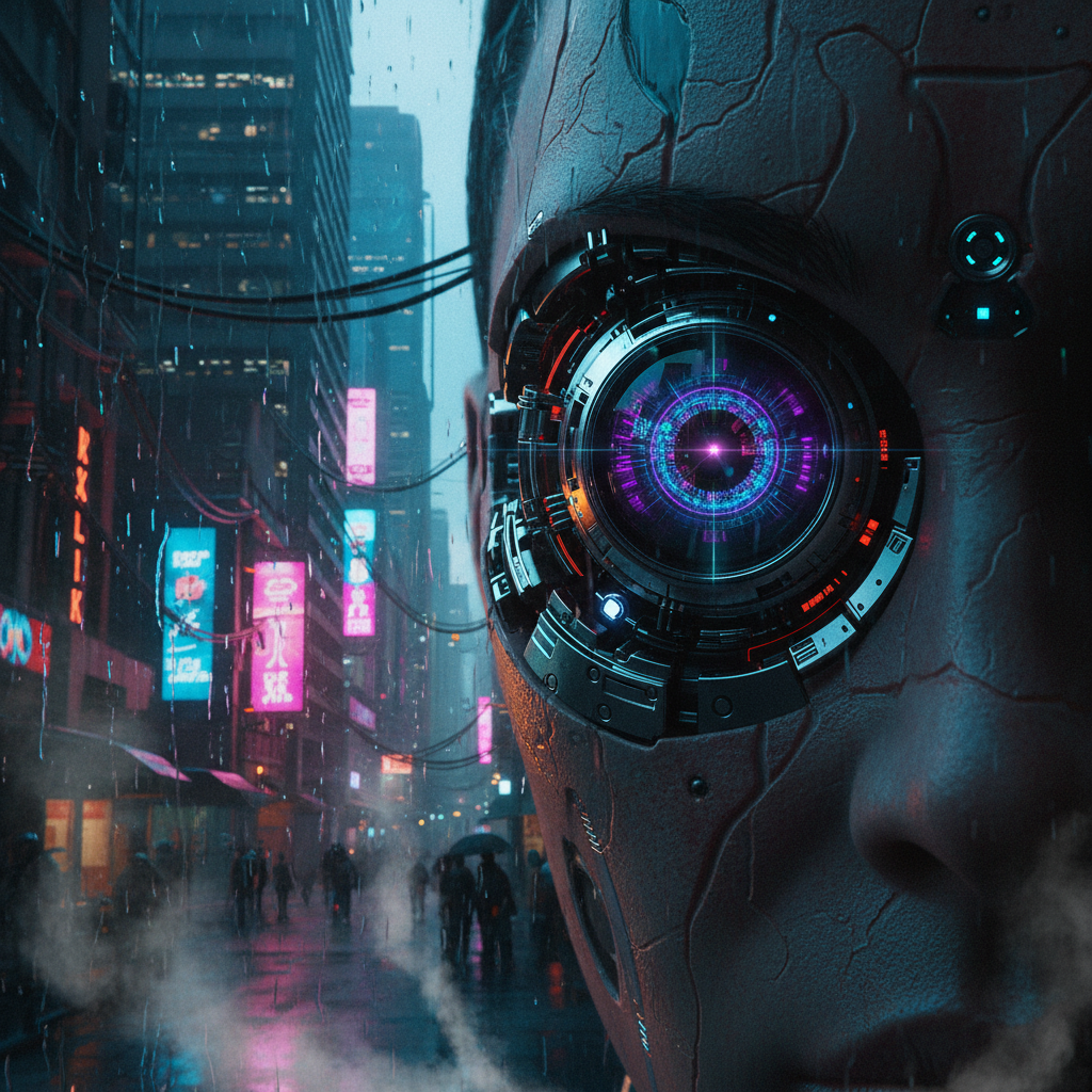 Zdjęcie: Scena inspirowana filmami science-fiction – postać z bionicznym okiem w cyberpunkowym otoczeniu.