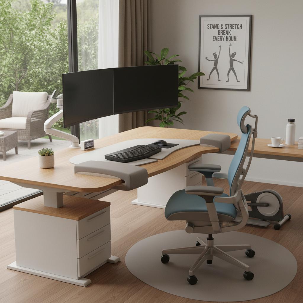 - Ustaw biurko na wysokości łokci – ręce powinny naturalnie opierać się na blacie.