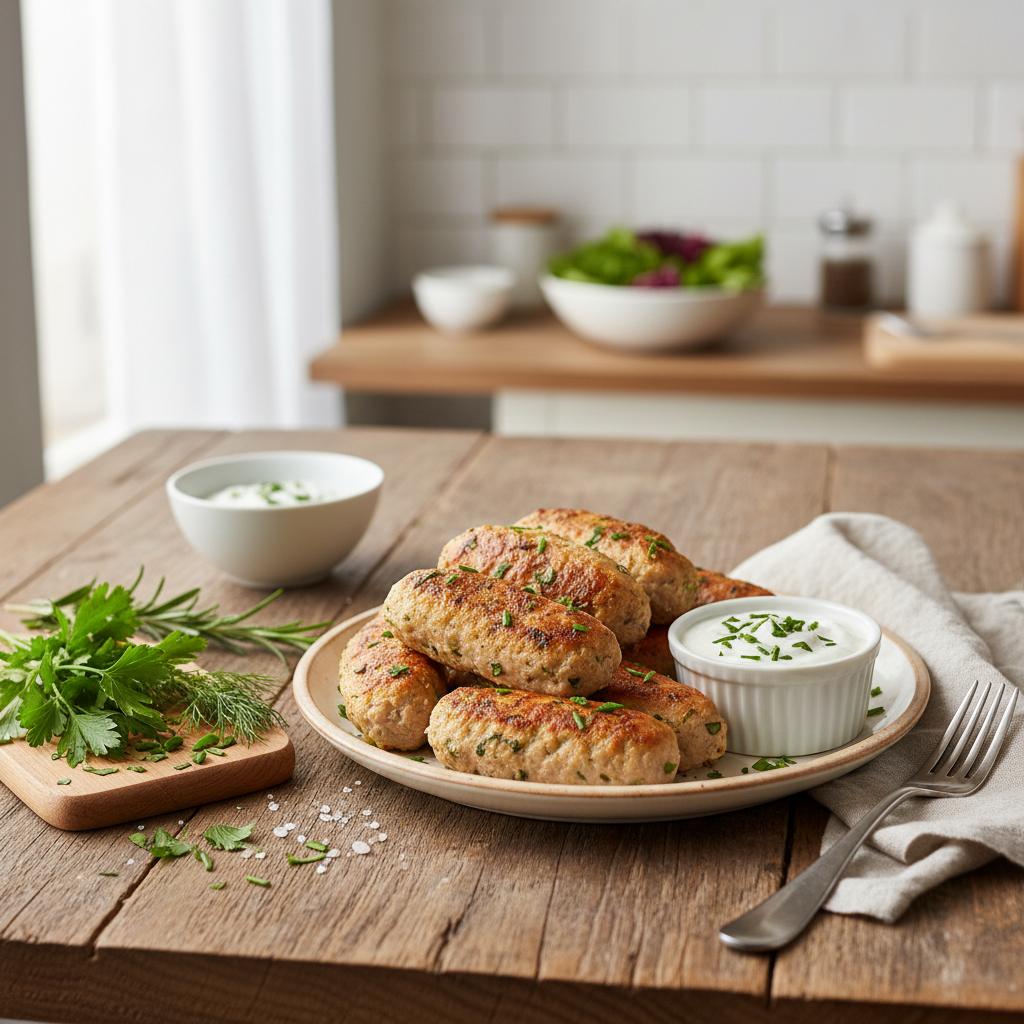 - Placuszki z kurczakiem i otrębami – zmielone mięso kurczaka, jajko i trochę otrębów, smażone na beztłuszczowej patelni.