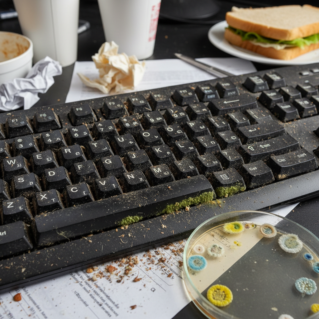 Według badań, klawiatura komputera bywa brudniejsza niż deska klozetowa. Średnio na centymetrze kwadratowym znajduje się od 400 do 700 kolonii bakterii. Telefony, piloty do rzutników czy wspólne drukarki to mikroskopijne pole bitwy, z którego pracownicy rzadko zdają sobie sprawę.
