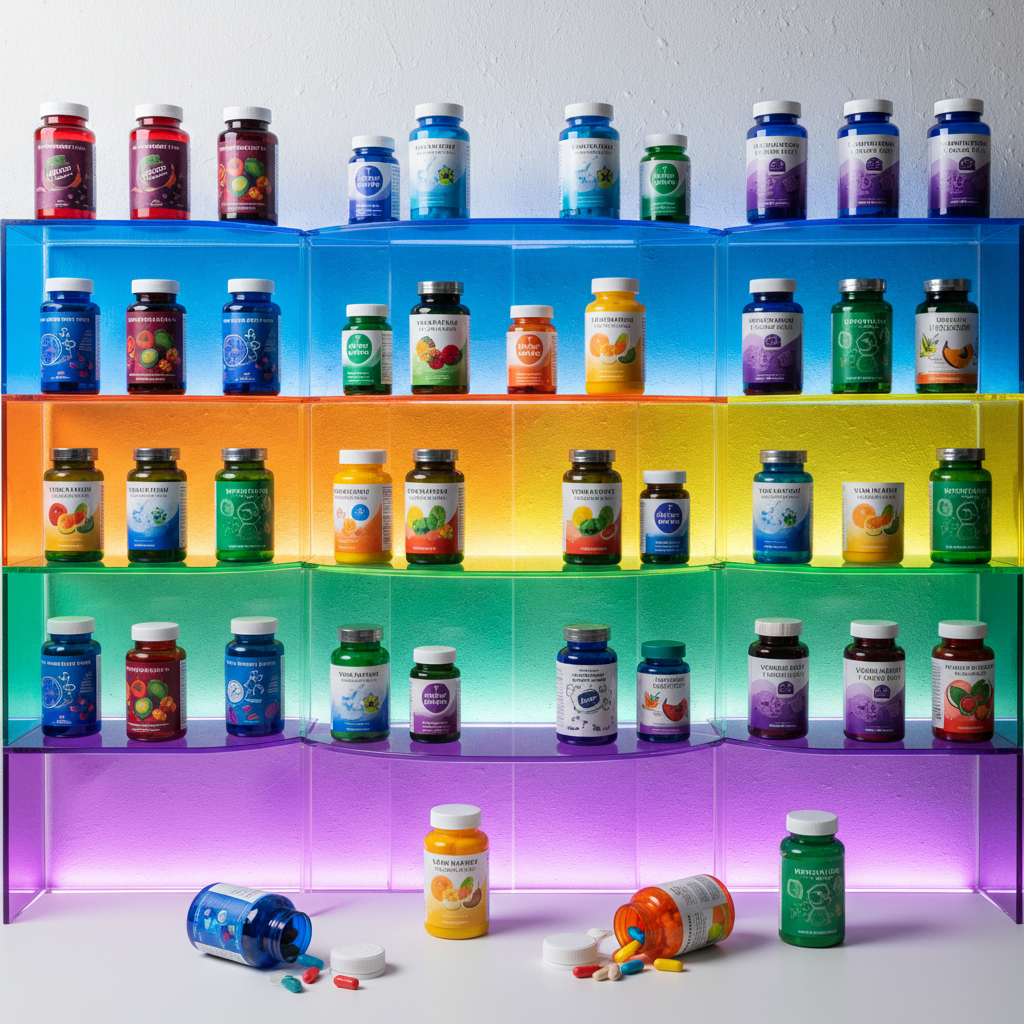 Półka pełna kolorowych suplementów i witamin – marketing kontra realne wsparcie odporności.