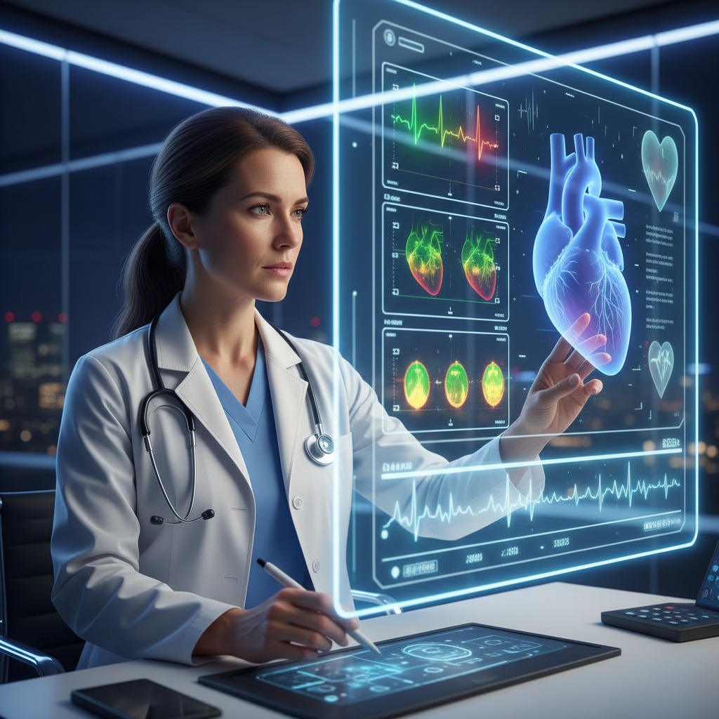 Alt: Sztuczna inteligencja analizuje dane kardiologiczne pacjenta, nowoczesna diagnostyka serca.