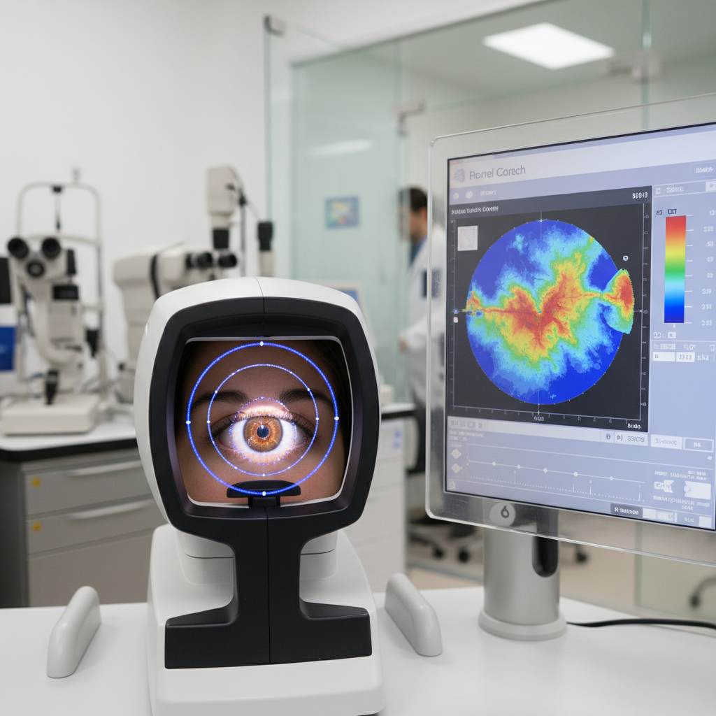 Diagnostyczne badanie krzywizny rogówki, kluczowe dla dokładnego określenia wad wzroku i bezpiecznego stosowania soczewek kontaktowych oraz planowania operacji okulistycznych.