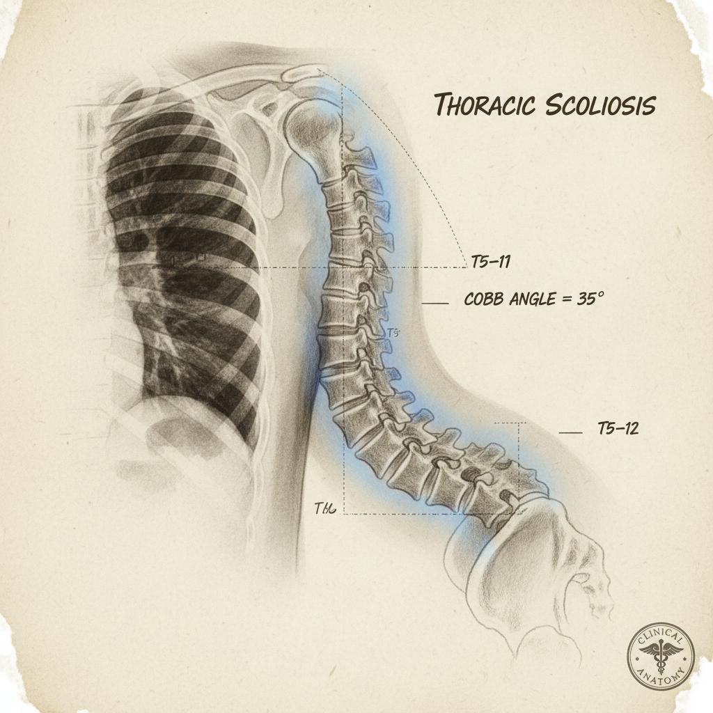 Boczne skrzywienie kręgosłupa z rotacją kręgów, najczęściej przekraczające 10° (kąt Cobba).