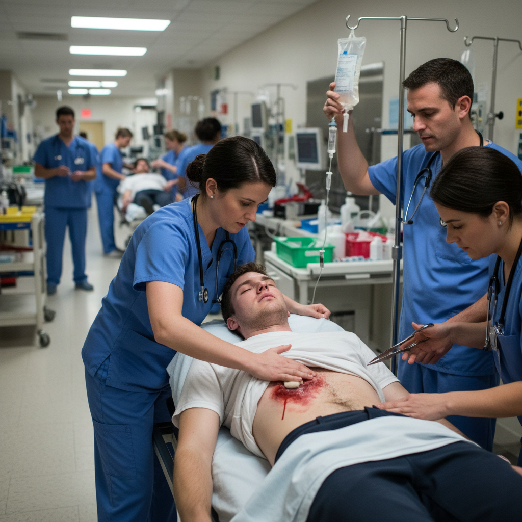 Zdjęcie: personel medyczny diagnozujący pacjenta z raną kłutą w okolicy klatki piersiowej.
