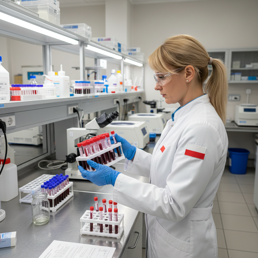 Alt: Laborantka w polskim laboratorium przygotowuje próbki krwi do badań SHBG, diagnostyka hormonalna, laboratorium medyczne