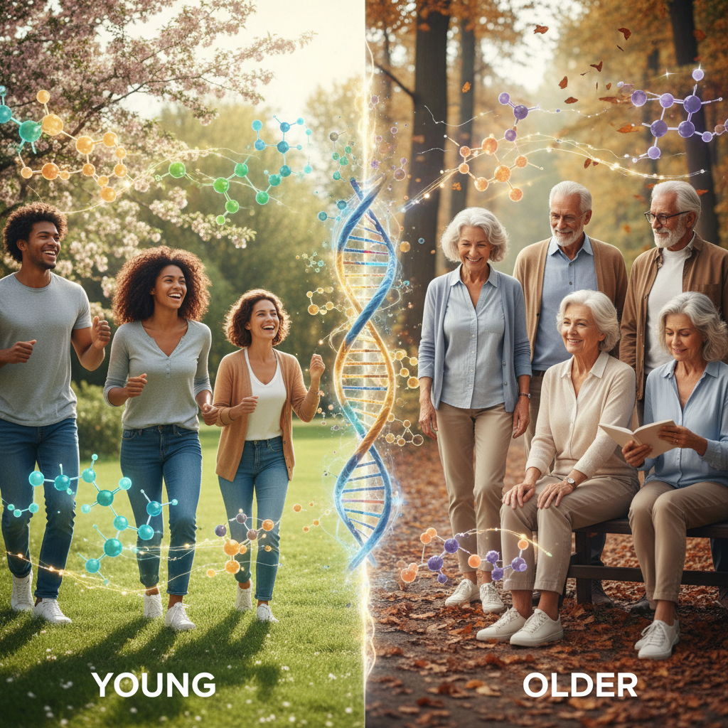 Alt: Artystyczne zestawienie młodych i starszych osób z nałożonymi cząsteczkami hormonów, SHBG w różnych etapach życia