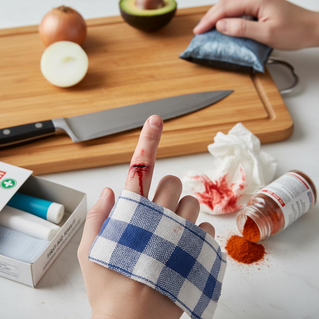 - Skaleczenie nożem podczas krojenia – silny ucisk palcem, opatrunek z czystej gazety lub papierowego ręcznika, uniesienie ręki.